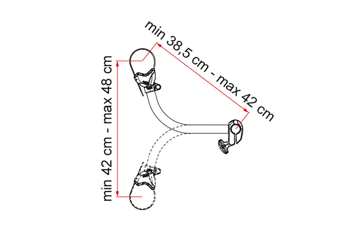 - Afstand tussen de kernen van de buis en fiets frame min. 385 mm en max. 480 mm