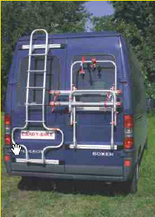 Fietsendrager van Fiamma geschikt voor busjes met twee achterdeuren. De achterdeur kan probleemloos geopend worden wanneer de fietsen nog op het rek staan. Kan worden gecombineerd met ladder Deluxe DJ.