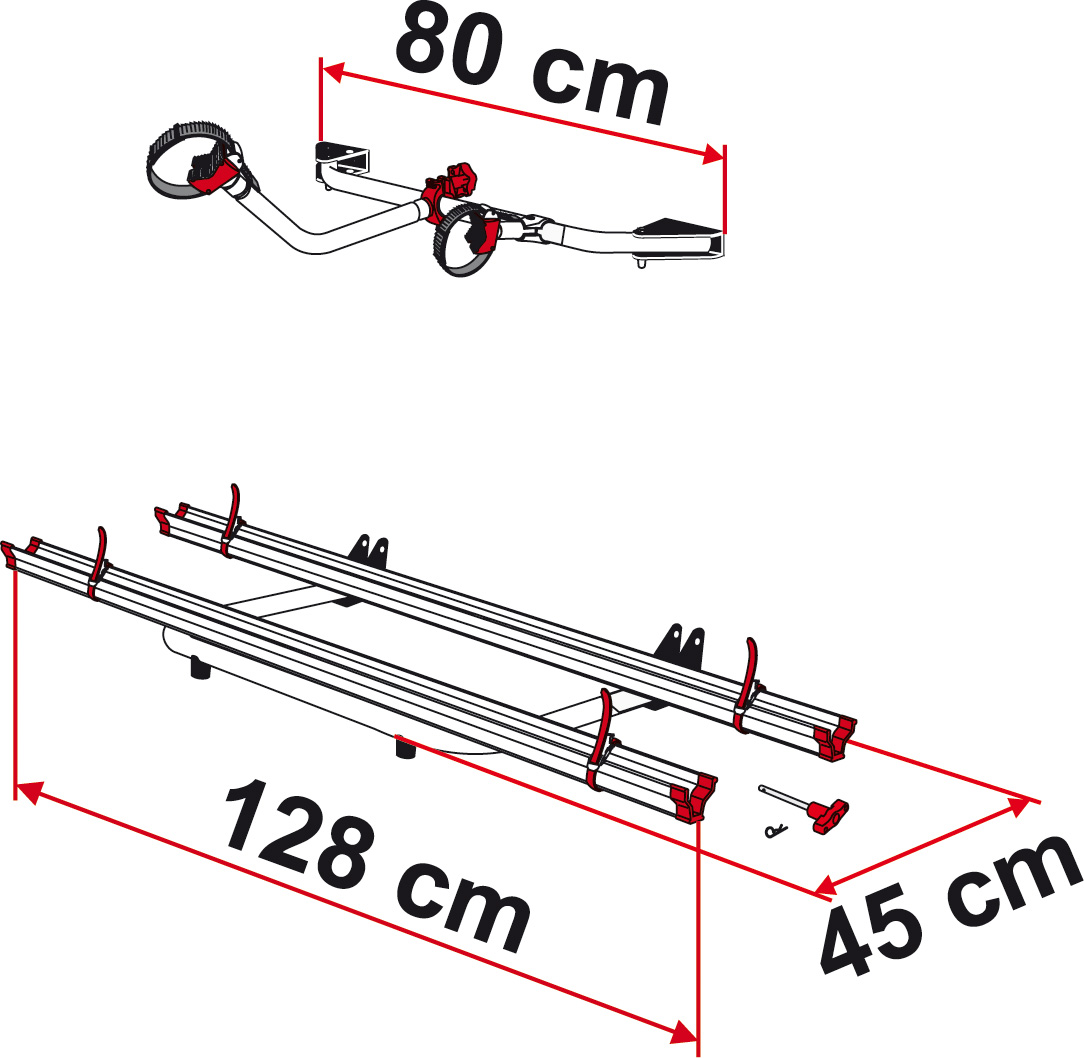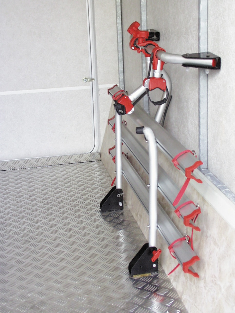 Fietsenrek geschikt voor campers met garage ruimte. Het rek wordt aan de onderkant vastgezet. Met wandbeugel voor het vastzetten van de fietsen.