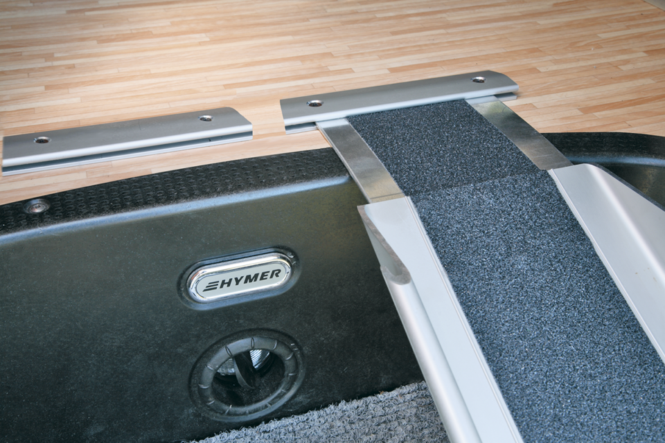 Uitschuifbare rail voor het oprijden van de scooter of brommer in de garage ruimte van de camper.