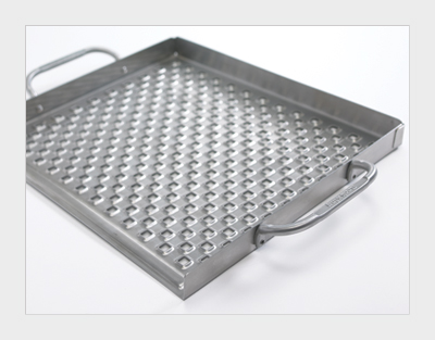 Voorzien van twee stevige roestvrij stalen handgrepen. De bodem is voorzien van speciaalvormgegeven vierkante perforatie gaten die door hun vormgeving aanbakken helpt voorkomen.
