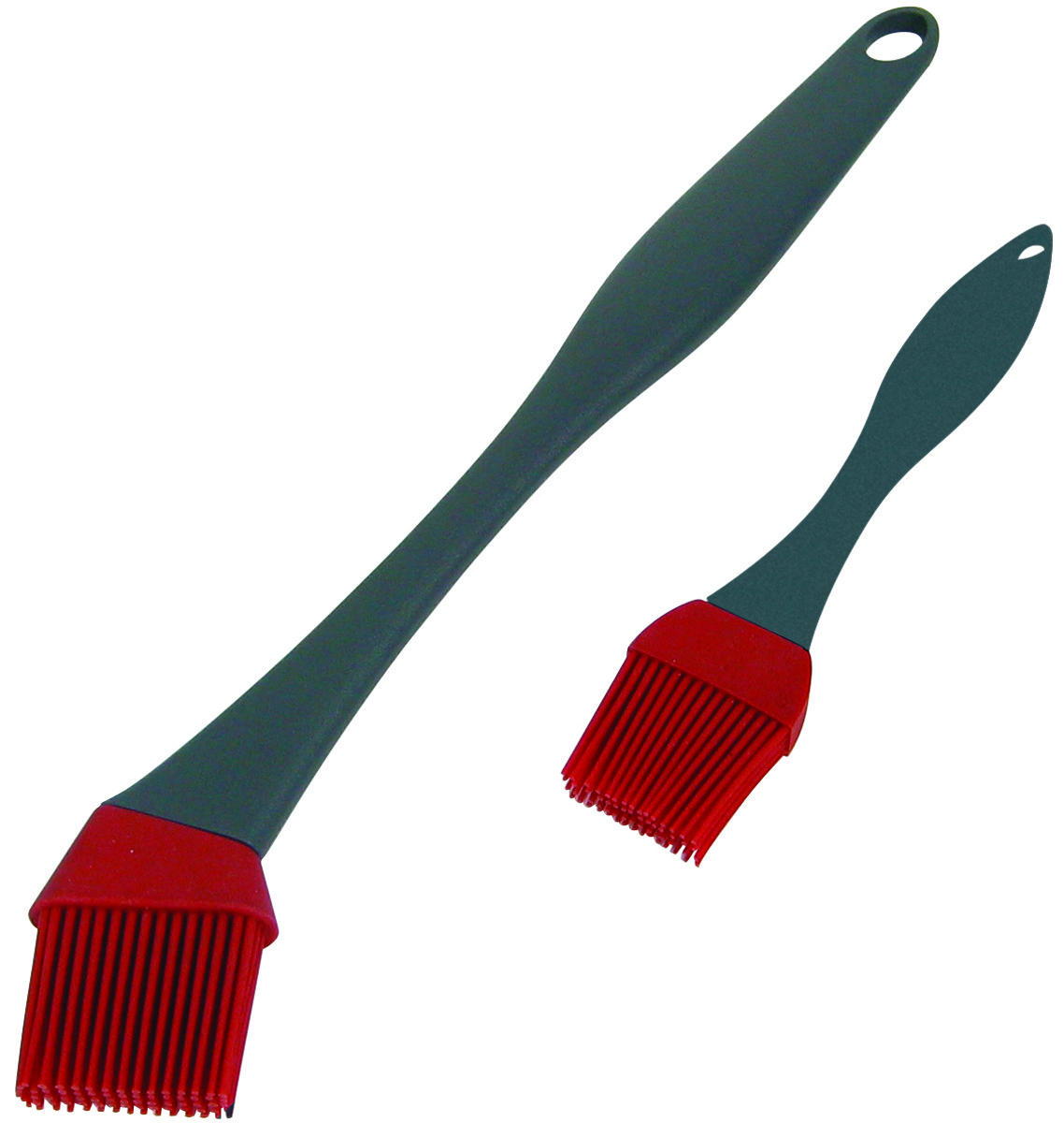 Set van twee siliconen barbecue kwasten. Eén kwast van 20,32 cm met rechte borstelkop en één kwast van 38,1 cm met haakse borstelkop. Hittebestendig tot 260ºC. Vaatwasmachinebestendig. Verpakt op displaykaart.